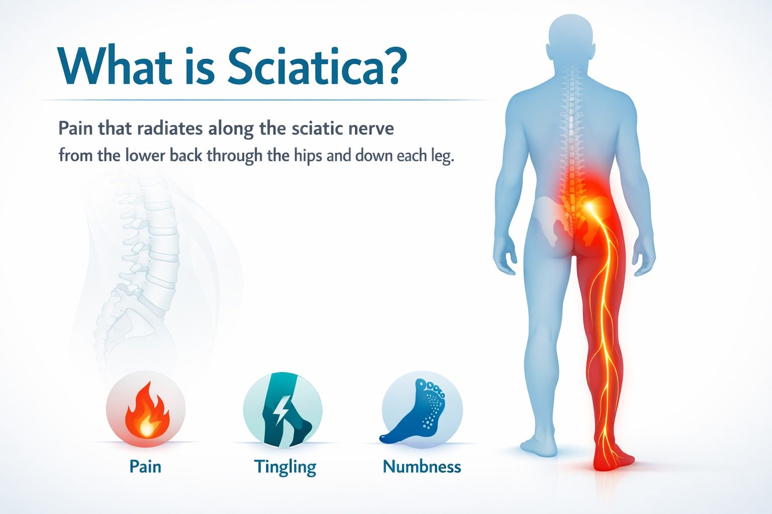 Sciatica is nerve pain that starts in the lower back and travels down the leg. If you feel sharp, shooting pain, numbness, tingling, or weakness in one leg, you may have sciatica. A doctor can confirm it through physical examination and scans.